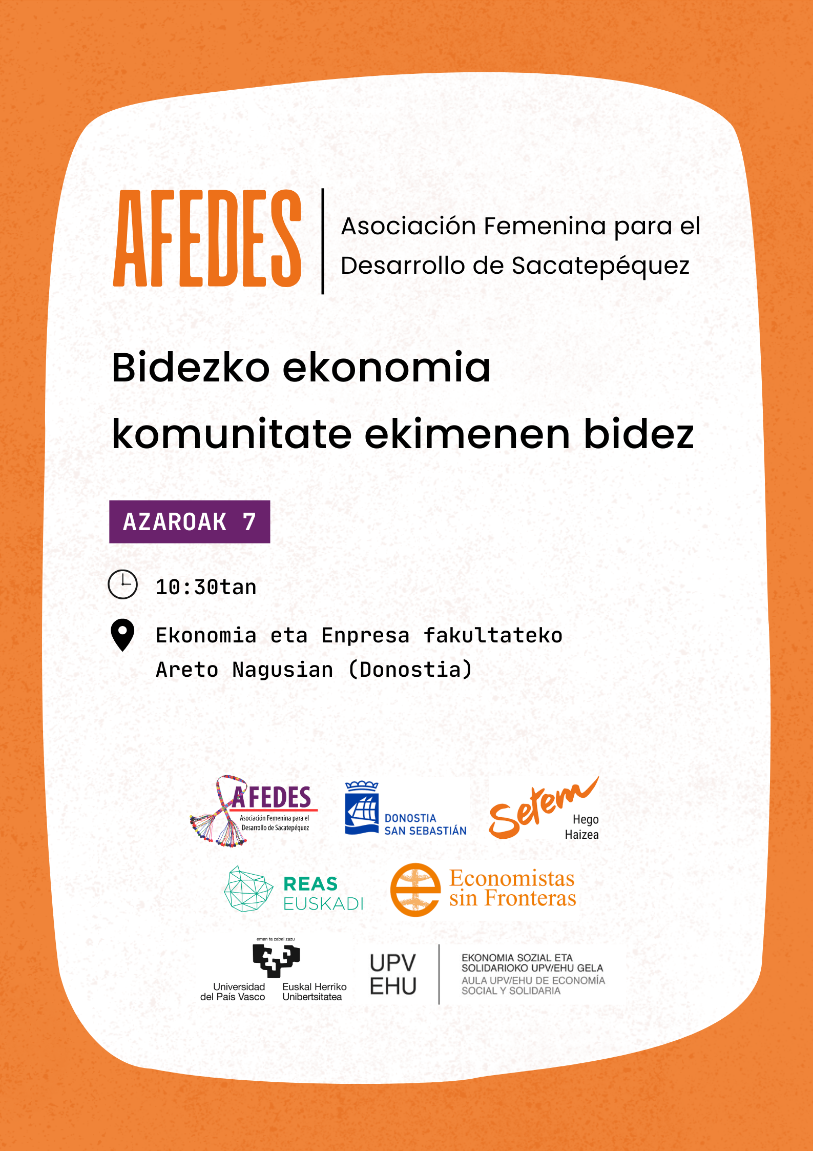 Topaketa hau Donostiako UPV/EHUko Ekonomia eta Enpresa Fakultatean egingo da (Oñati plaza, 1, 20018 Donostia, Gipuzkoa) azaroaren 7an, ostirala, 10:30ean.