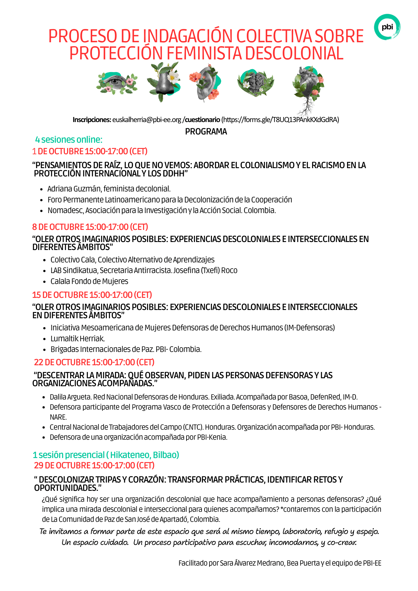 Bideratzaileek eremu zaindu bat sortzeko gakoak adostuko dituzte, entzuteko eta begirada zabaltzeko aukera emango dutenak. Halaber, gure buruari galdetu beharko diogu nola gauzatu praktikan narratiba feminista, dekolonial, antirrazista eta intersekzional horiek, hizkuntza aldatzeaz harago. Agian, galdera gehiagorekin irtengo gara, prozesu horrek zeharkatzen baitizkigu burua, begirada, bihotza eta barruak.