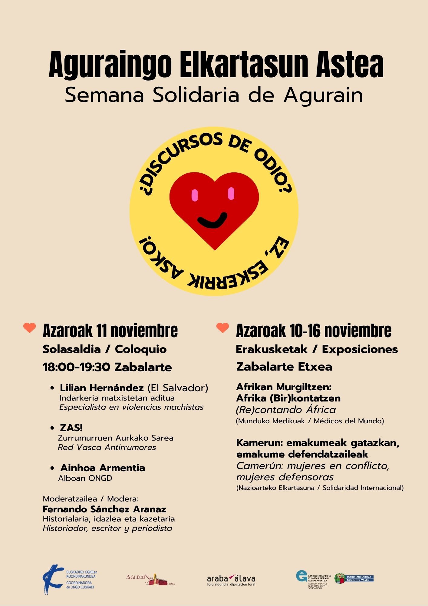 - El martes 11 de noviembre, a las 18:00 en Zabalarte, un coloquio reunirá varias experiencias frente a los discursos de odio, con Lilian Hernández (de El Salvador), la red vasca antirrumores ZAS!, la ONGD Alboan y el periodista Fernando Sánchez Aranaz.